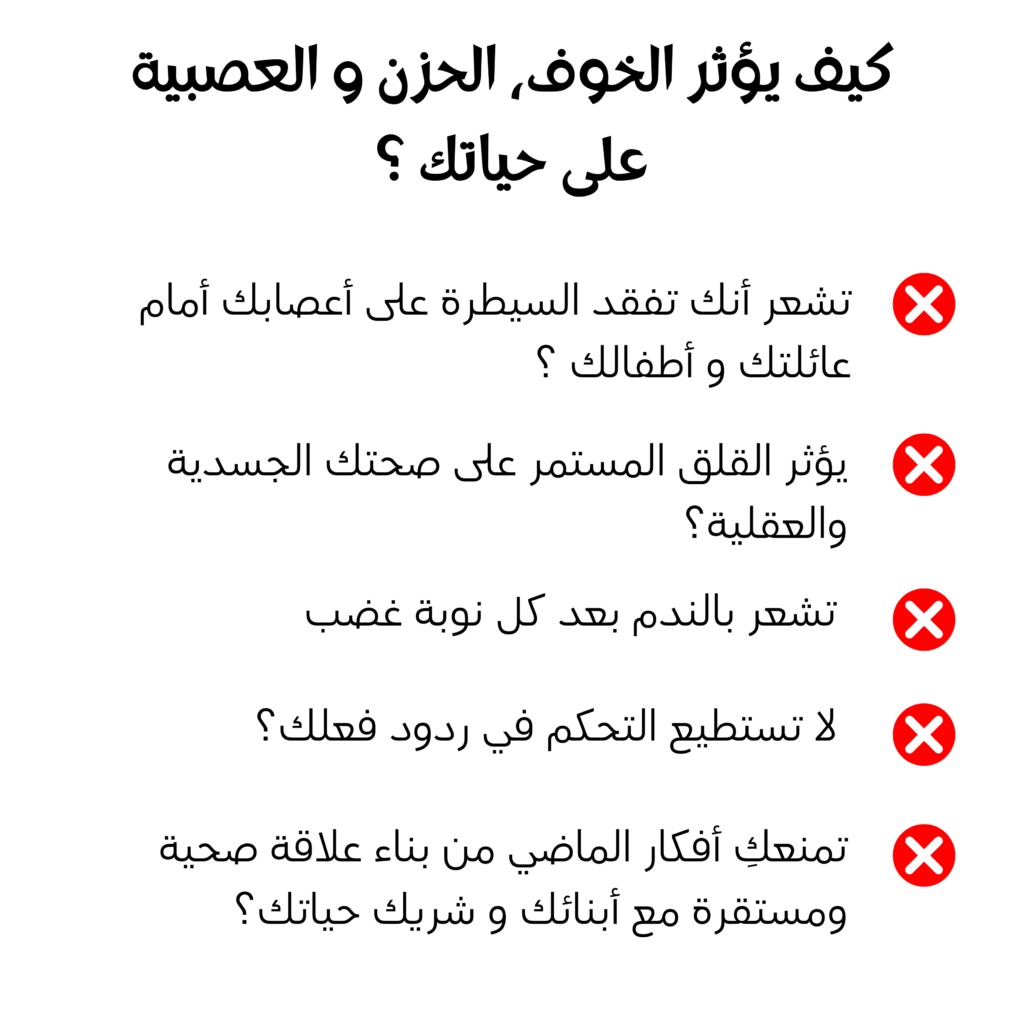 تحكم في مشاعرك السلبية: اكتشف الأسباب الحقيقية وراء شعورك بالغضب، الخوف، أو الحزن، وتدرّب على تقنيات عملية تساعدك على إدارة هذه المشاعر بفاعلية، بدلاً من أن تتحكم هي بكِ.