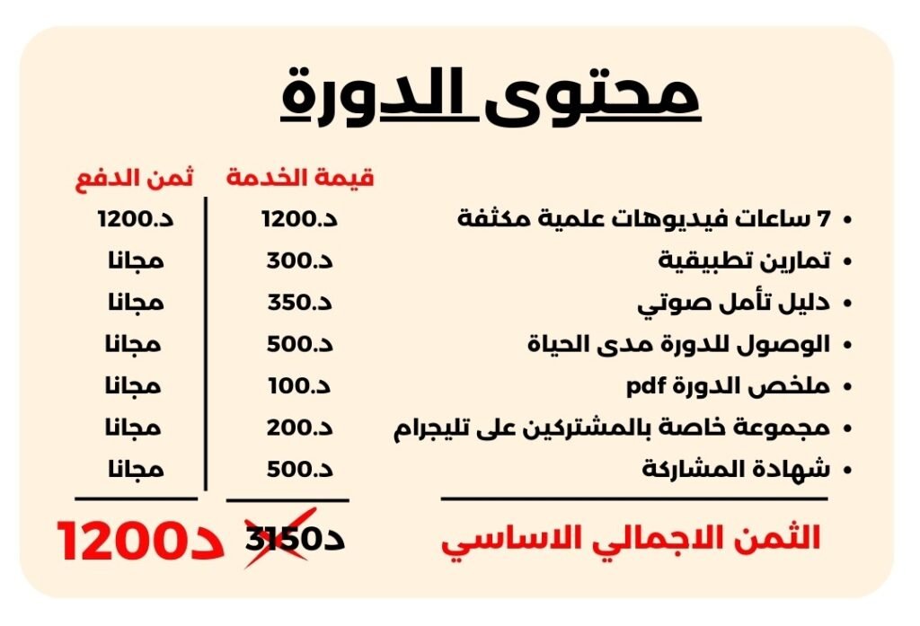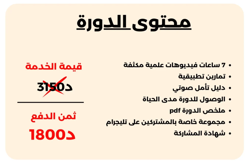 لكنني أعلم جيدًا أن جلسات الاستشارة الفردية ليست متاحة للجميع، ولهذا أنشأت هذه الدورة بتكلفة مناسبة، لتكون بديلاً عمليًا ومؤثرًا.